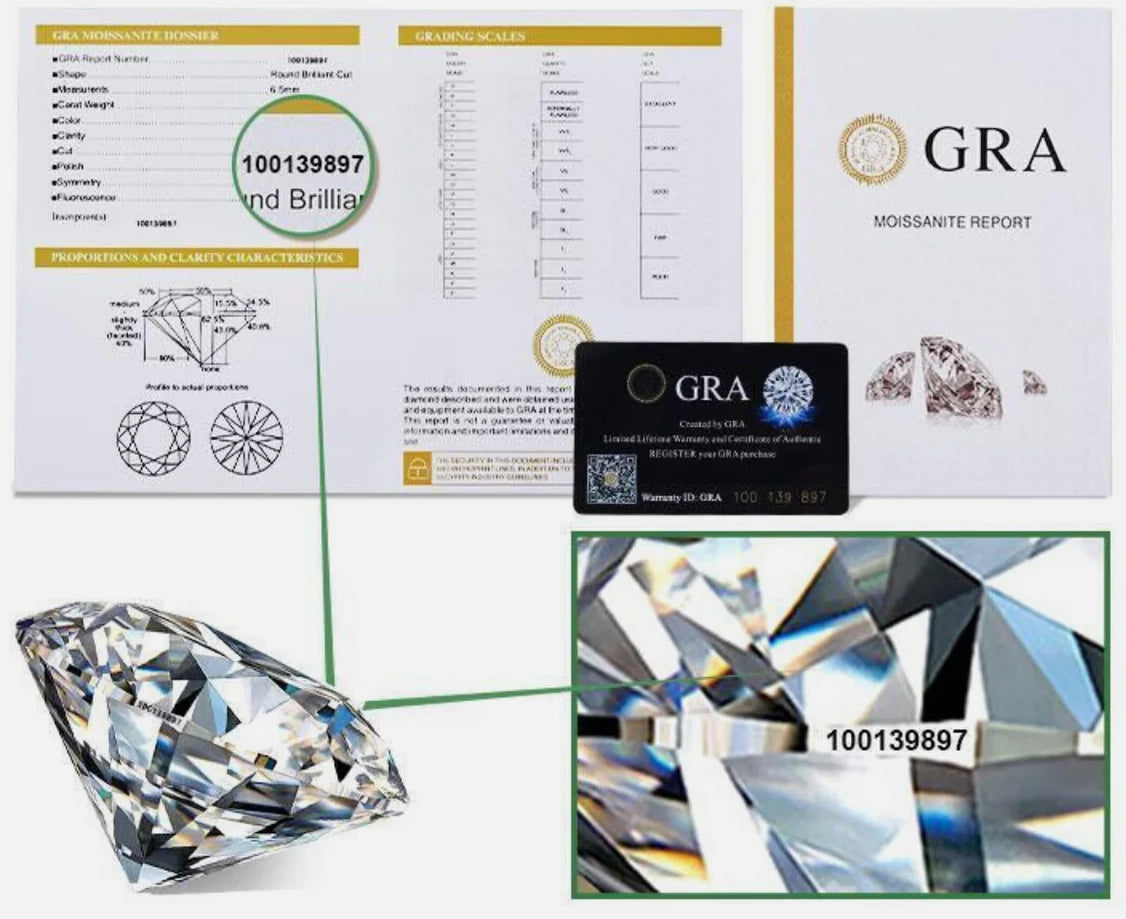 Każdy produkt (moja firma) posiada Certyfikat Autentyczności GRA, gwarantujący 100% autentyczności moissanitu. Każdy kamień posiada unikalny numer seryjny, potwierdzony raportem oceny czystości, szlifu i nieskazitelnego blasku.